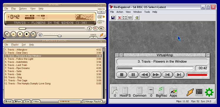 To use, you must first start WinAmp in Windows, and, usefully, create a decent playlist (easily done by just dragging a folder full of mp3s to the WinAmp window!). Then run !VirtAmp and click on its bar icon. The controls should all be self explanatory - they're deliberately copied from the standard RISC OS CDPlayer application.